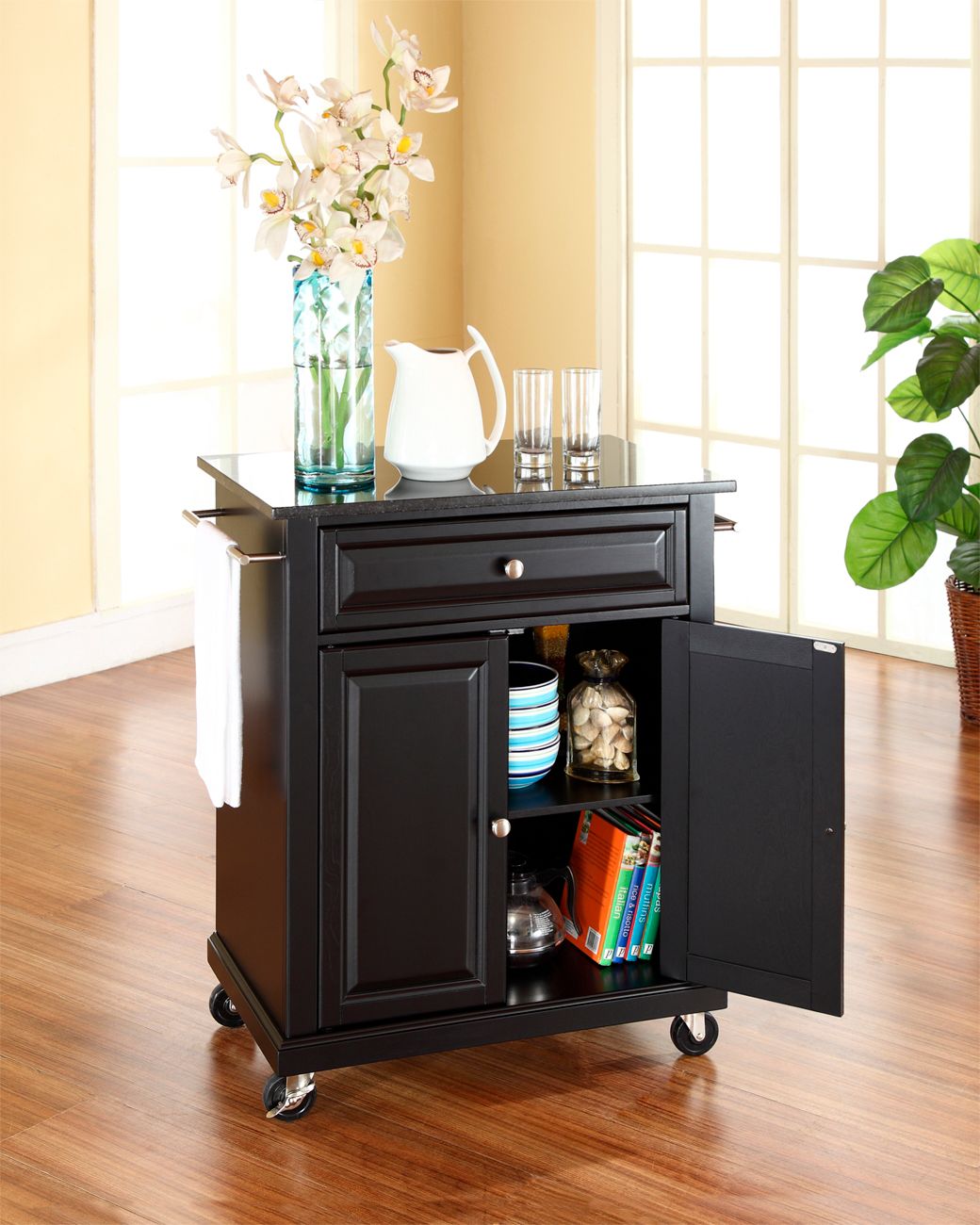 These versatile carts are movable and feature storage space for your dining and entertaining needs. This handsome black granite top island boasts solid hardwood and wood veneer construction with sophisticated styling featuring raised panel doors.